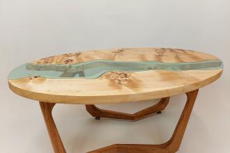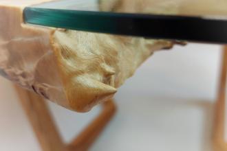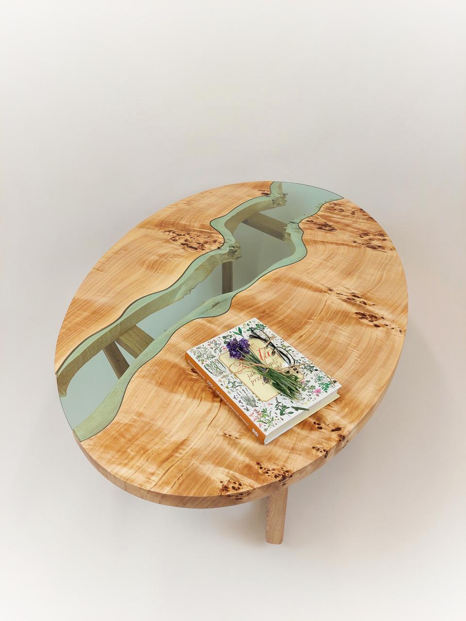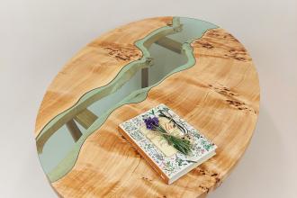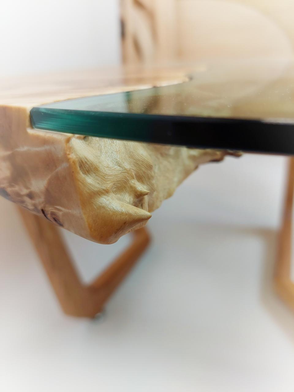 Blat powstał z wyjątkowego czeczotu topolowego, który charakteryzuje się trójwymiarowym usłojeniem i bogatą kolorystyką. Wkomponowana tafla hartowanego szkła (6 mm) została precyzyjnie docięta do naturalnego kształtu drewna, tworząc kompozycję inspirowaną brzegiem rzeki lub kanionem.