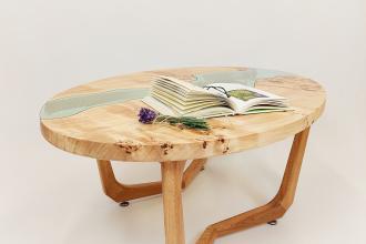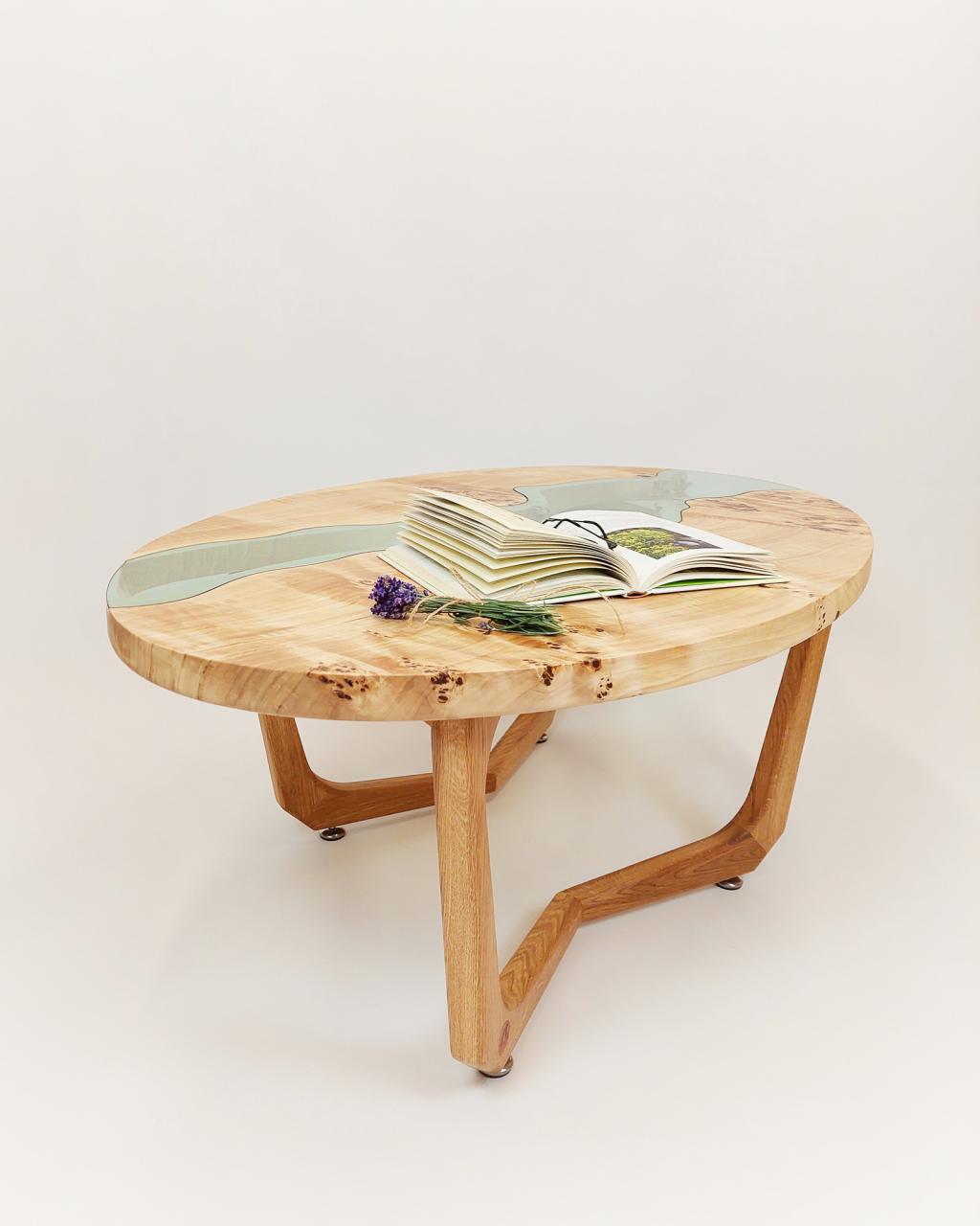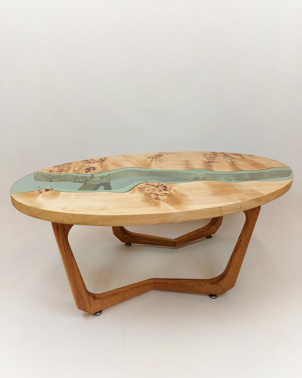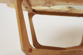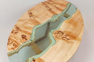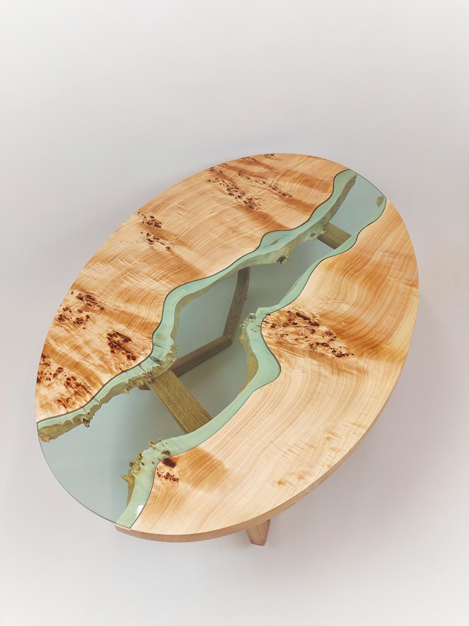 Blat powstał z wyjątkowego czeczotu topolowego, który charakteryzuje się trójwymiarowym usłojeniem i bogatą kolorystyką. Wkomponowana tafla hartowanego szkła (6 mm) została precyzyjnie docięta do naturalnego kształtu drewna, tworząc kompozycję inspirowaną brzegiem rzeki lub kanionem.