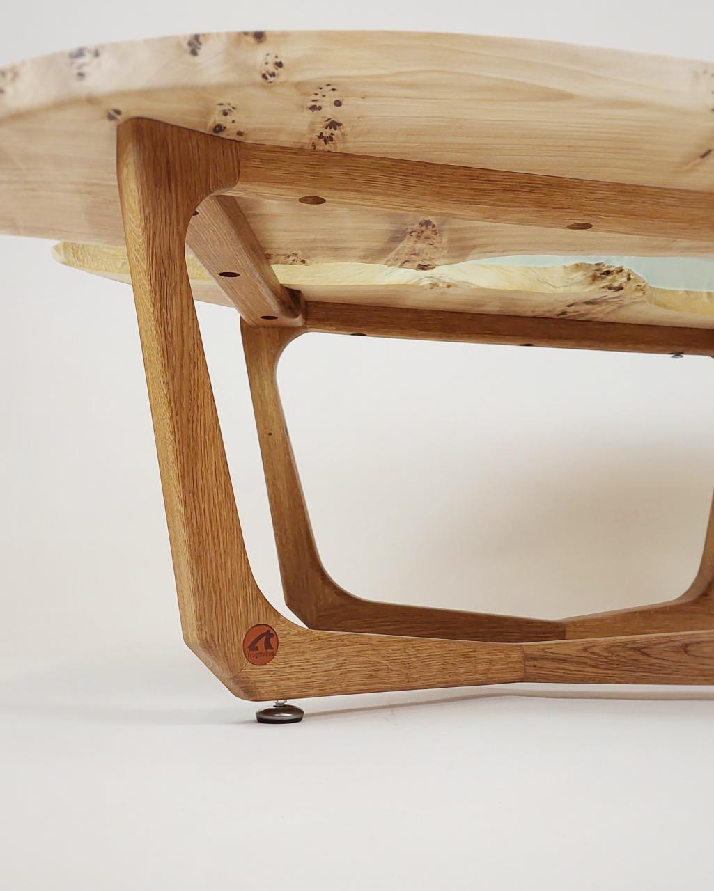 Każdy stolik jest unikatem – kształt drewna i szkła nigdy się nie powtarza. Szablon szkła zapisuję w mojej bibliotece, by w razie potrzeby umożliwić zamówienie nowej tafli.